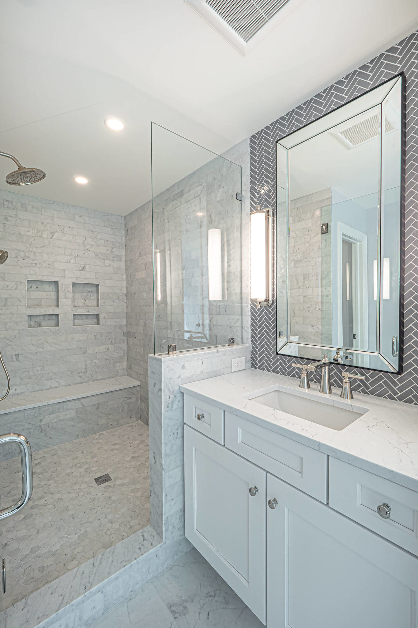 - Natural stone/quartz countertops with 3” backsplash in primary bath